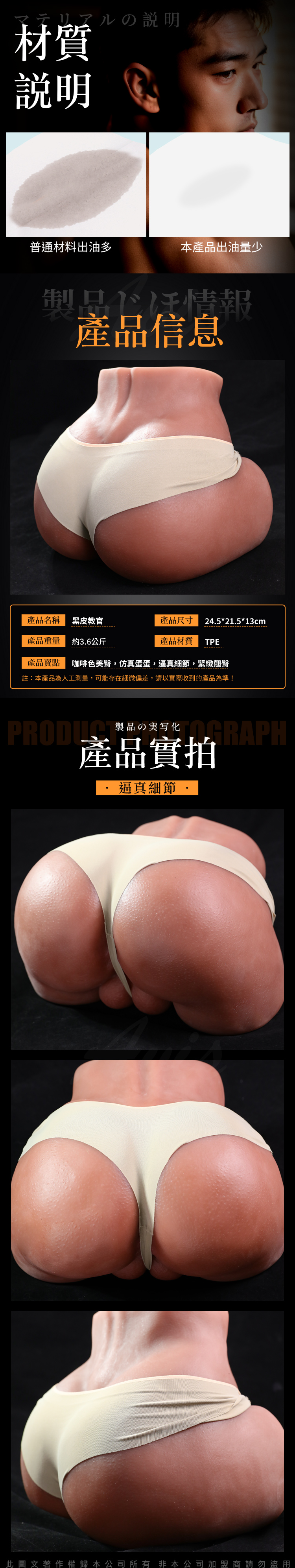 商品名稱:黑皮教官|仿真翹臀肌膚紋理逼真|肛交自慰器-3.6kg